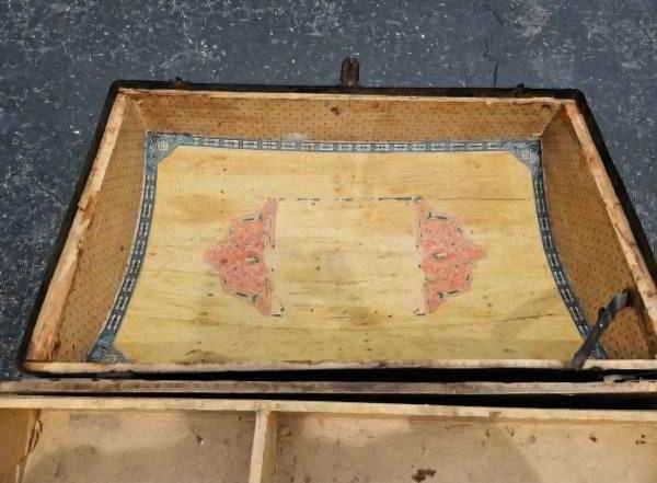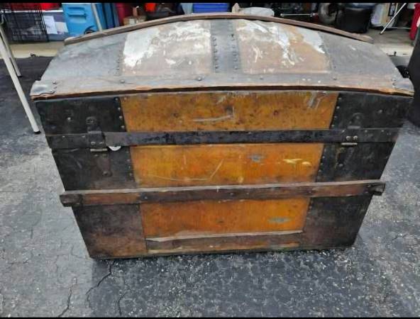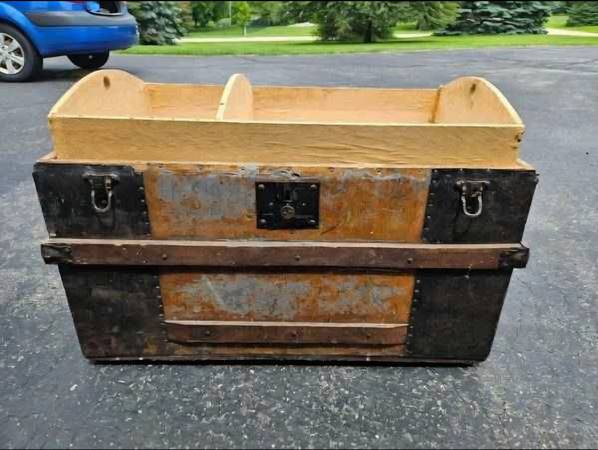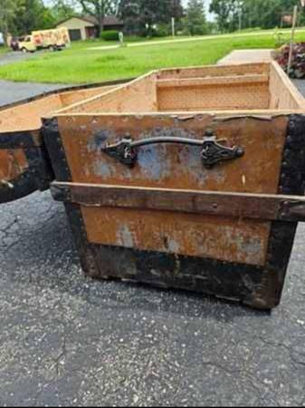 We had someone look at it and they said it's at least 100 years old. It's in good condition for it's age. It has rough parts all over it and in the inside due to it's age. It has 2 handles, one per side and 4 small roller wheels on the bottom that work. It's mostly all wood except for some metal brackets, locks and pieces on the top of the chest. It is missing one metal bracket on the inside, the hinge for the top. No keys for any of the locks. It's sturdy and heavy. Measurements when open: The base is about 28in across, 16.5in from front to back, wide and 14in deep. The top is about 28in across, 16.75in wide and 8.5in deep and the highest part. Measurements when closed: it's 31in across, 18.75in wide, front to back and about 25in tall. Italso as a removable shelf that is unfinished.