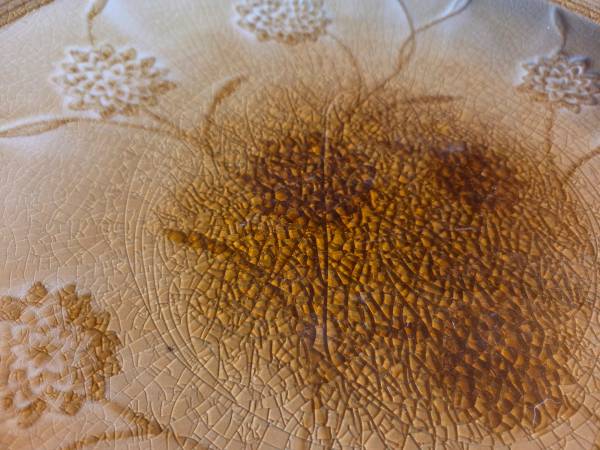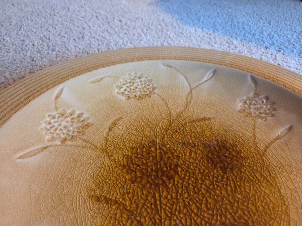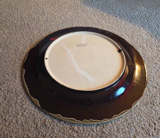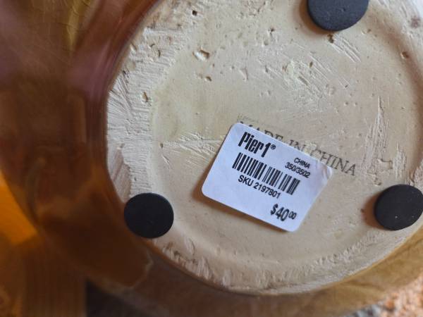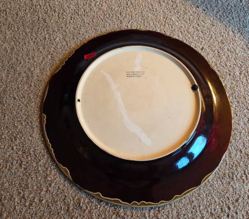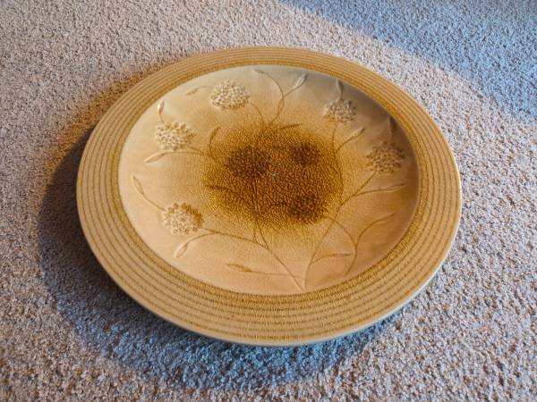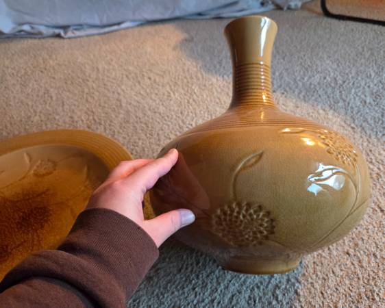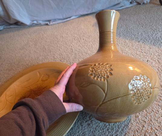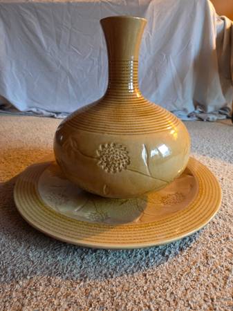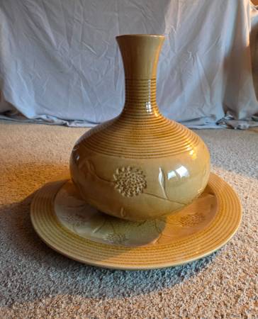 They are very pretty and impressive looking, it's hard to catch that in the pictures. They are new. They were never used, just stored. They are both yellow, a mustard like color yellow with brown accents. They are both heavy and I believe they are ceramic. The plate is 18.75 inches round and sits about 1.75 inches high. The vase is about 14 inches tall and about 10 inches round and the widest part. Base is 4.25 inches round and the top is 3.25 inches round. The inside is 13 inches tall.