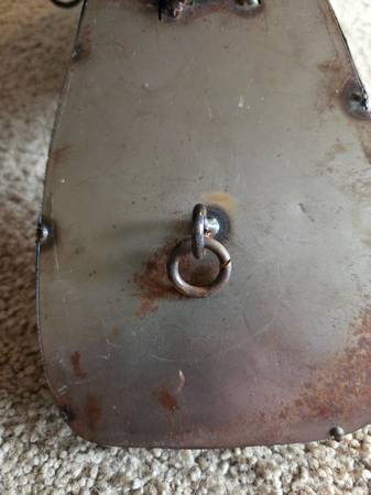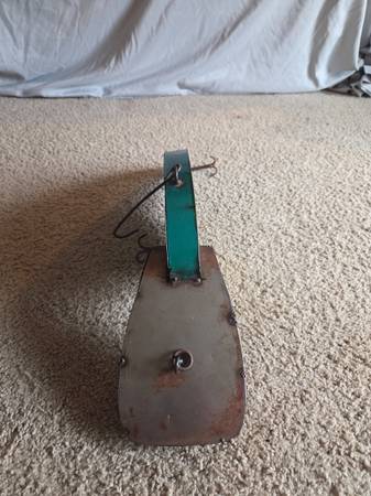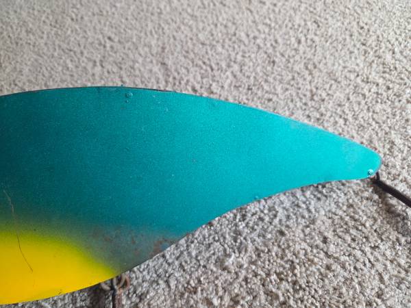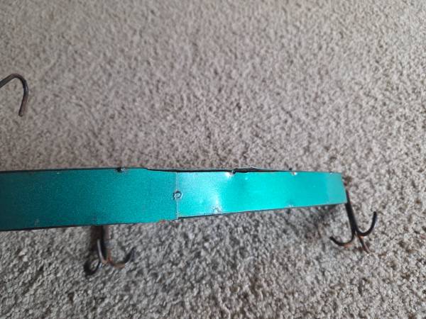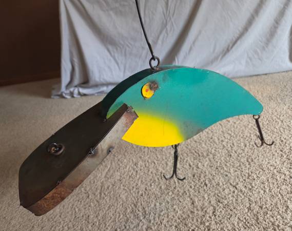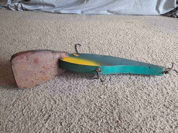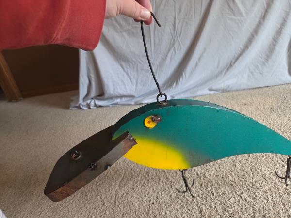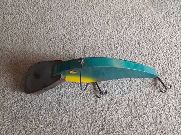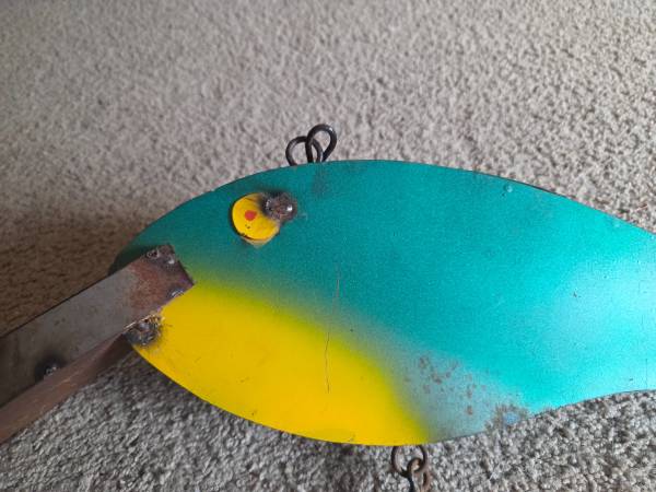 Gently used, displayed only, like new. It's supposed to have the rusted metal look. It's made of all metal and it is heavier. It has 1 large hanging hook on the top center part of the lure and 1 small hanging ring on the too center of the lure head. It's a vibrant bright green with bright yellow accents. It's shiny and shimmery justice real fishing lures. It has 2 three sided hooks on the bottom, very cool decoration for any fisher. It's about 9" high (highest part) x 20.5" long x 4.5" wide (widest part).