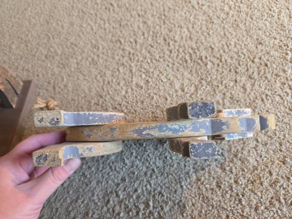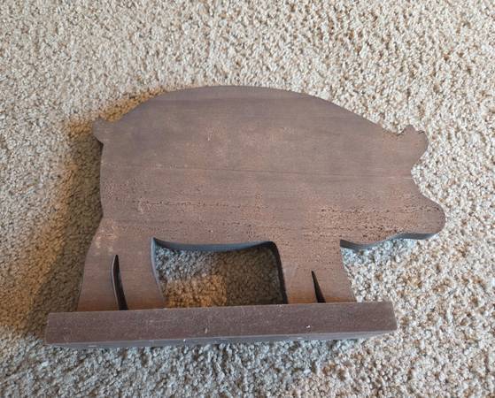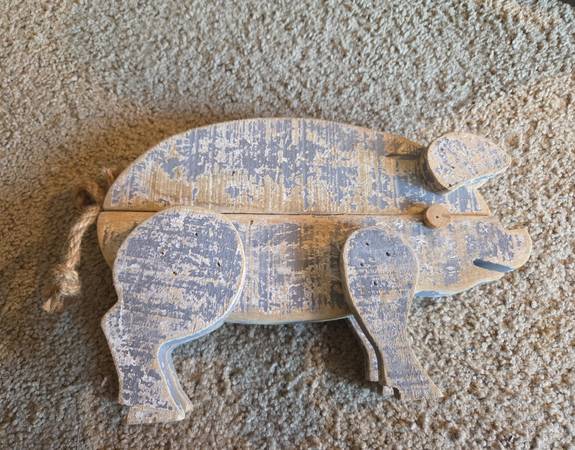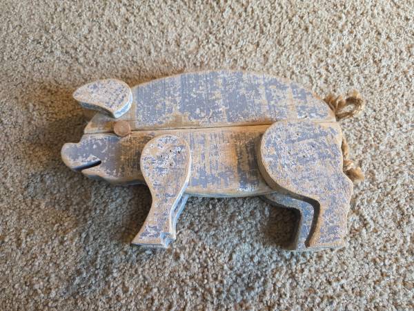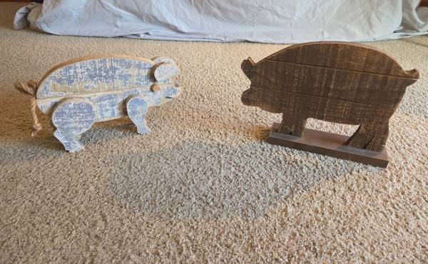 Both were very gently used, displayed only, like new. Both are wood statues with a barn wood look. They both stand evenly and are sturdy. 1 dark brown pig standing on a rectangular stand. 1 side is a smoother wood side and the other has weathered worn look. It's about 8.75" tall x 11.5" long x 2.25" wide. The 2nd pig is blueish gray and beige with 3D legs, ears, tail and eyes.it has an adorable rope tail and it stands on the four legs it also has a distressed barn wood look. It's about 7.25" tall x 11" long x 2" wide.