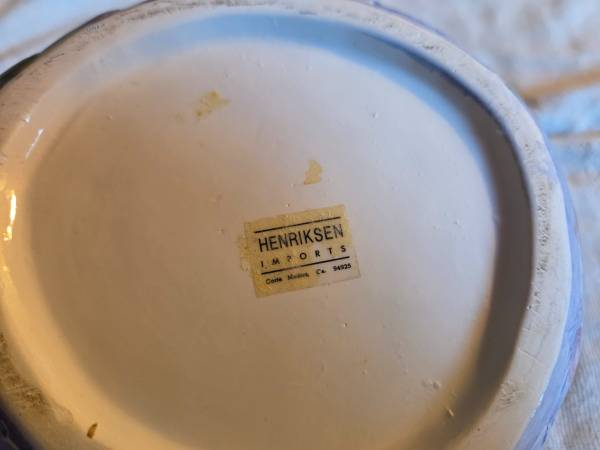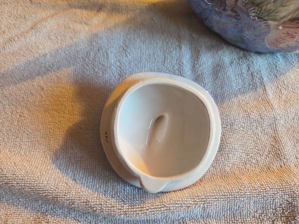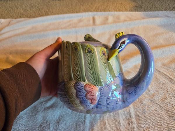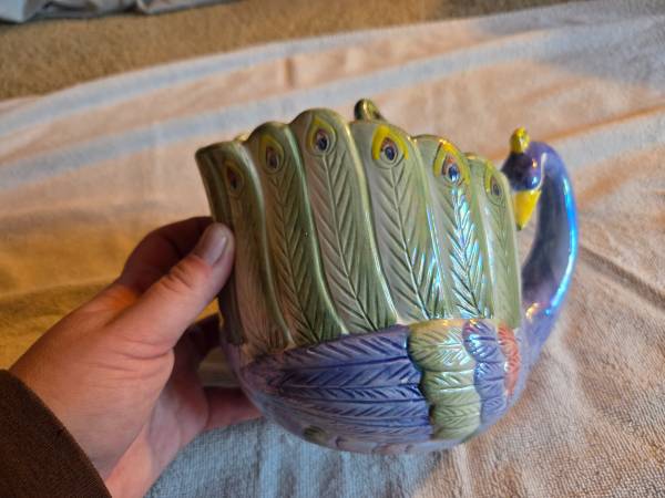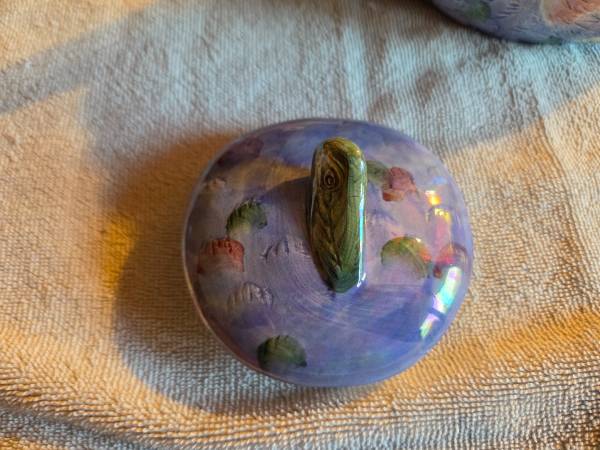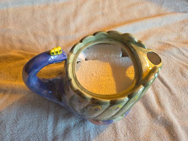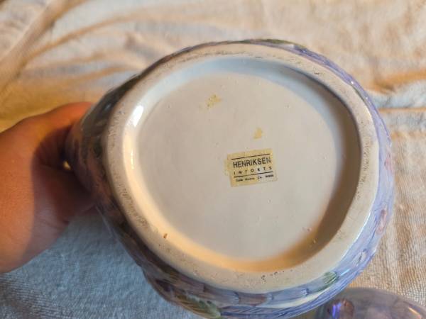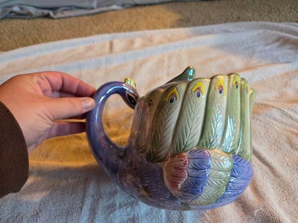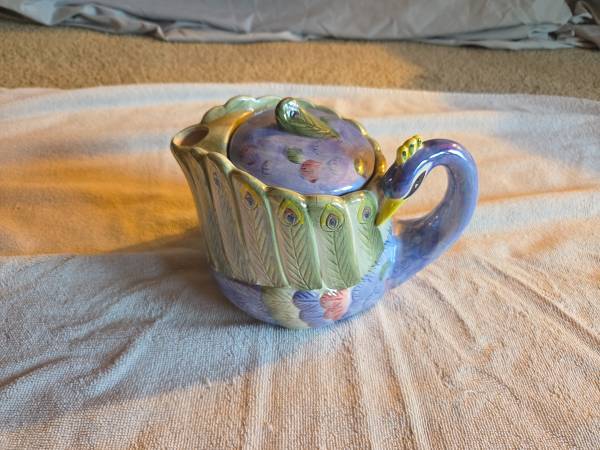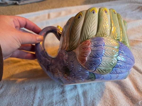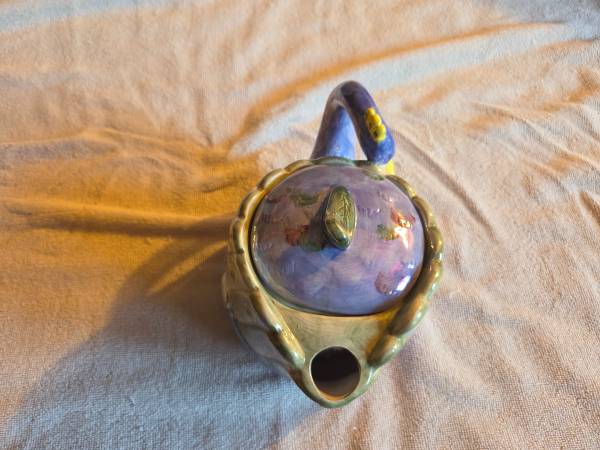 Very gently used, displayed only, in excellent condition. Like new. There are no chips, cracks or breaks. This is vintage 1980's. It's a ceramic teapot and it's very shiny and iridescent. Its mostly purple/blue and a lighter green. This is a Hendricksen Import. It's about 7.5" (L) x 5.5" (W) x 6" (H).