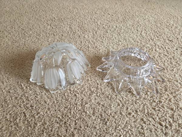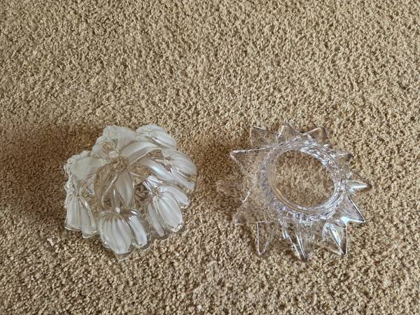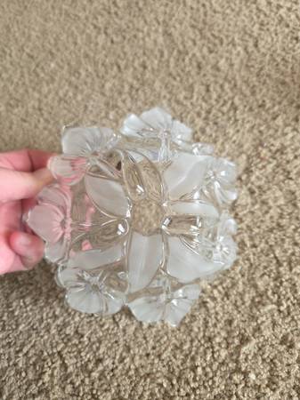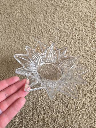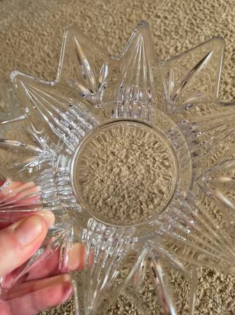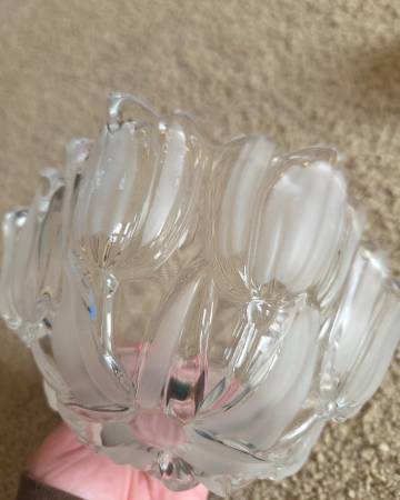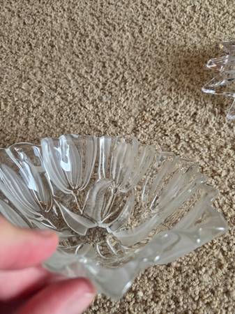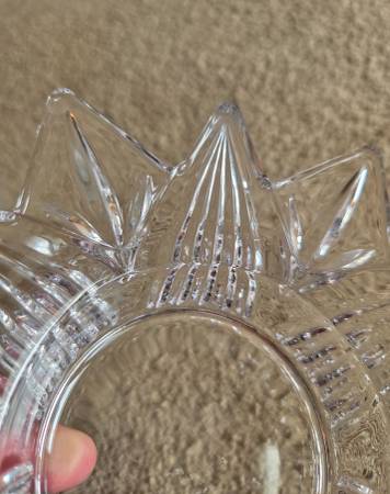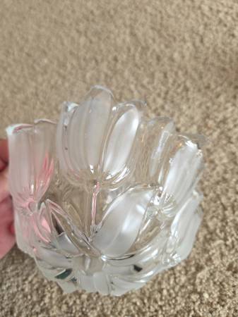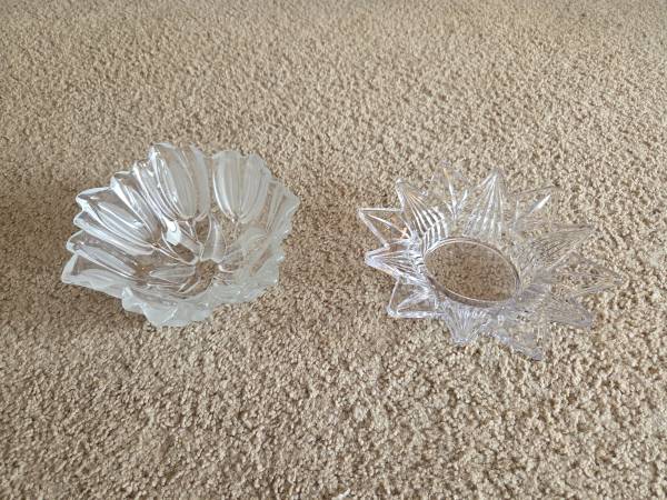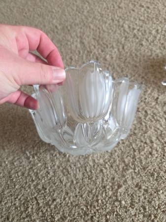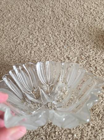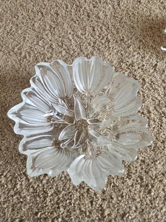 Both were displayed only and like new. Both are real Mikasa Crystal, clear crystal. The 1st one is Mikasa Satin Tulips frosted hostess. It's a deep dish with a frosted and raised pattern on the exterior, the interior is smooth crystal. It's heavier and sturdy. It's about 2.75" tall x 6.5" round.
