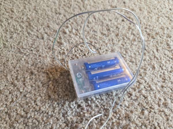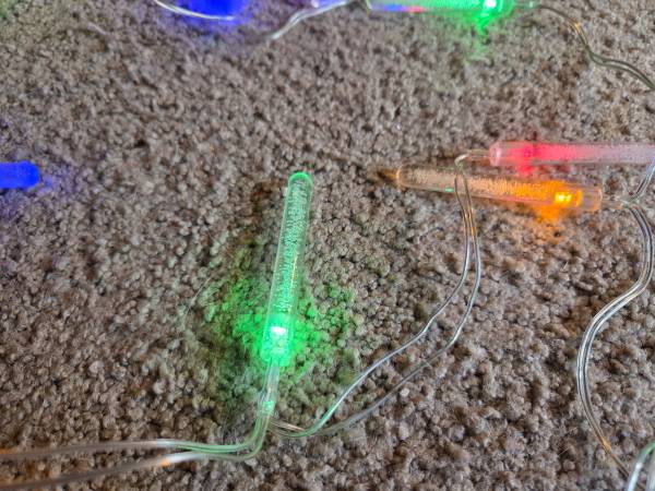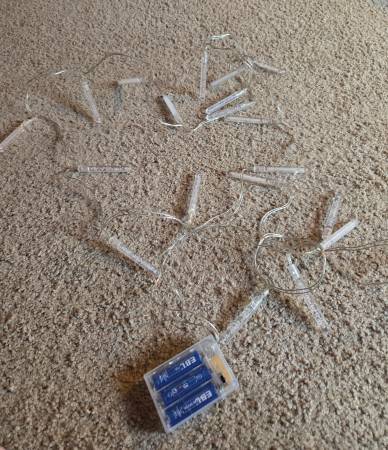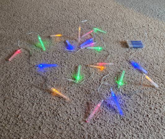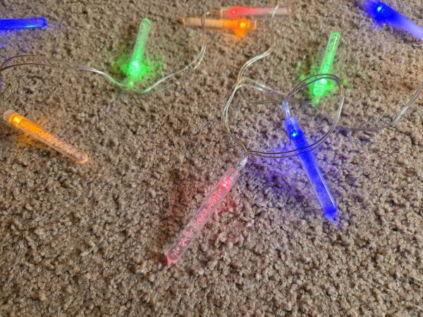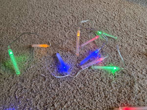 Gently used and in excellent condition, like new. There are 19 bulbs with 4 different colors; blue, yellow, green, and red. They are clear cylinders with tiny bubbles on the inside on a clear cord. The bubbles do not move or bubble up. They are battery operated and take 3 double A batteries. They have 3 settings; off, blinking, and steady. They are about 10' 8" long with a 5.5" length between each bulb. The bulbs are 3" long and about 1/4" round.