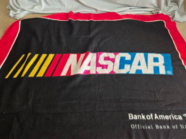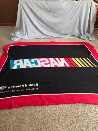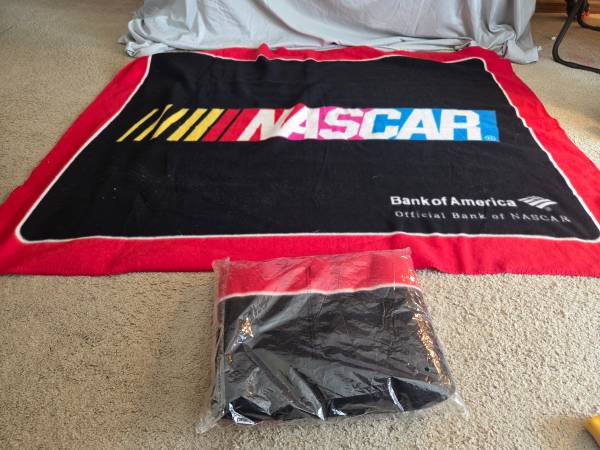 The blankets are new, never used. 1 is still in the original packaging. The blankets are both the same, they are black with red edging and the Nascar logo in the center and the Bank of America logo on the right front corner. They are very soft and are 54 by 44 inches.