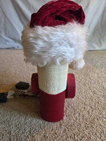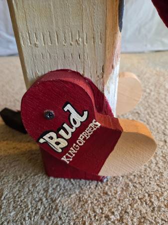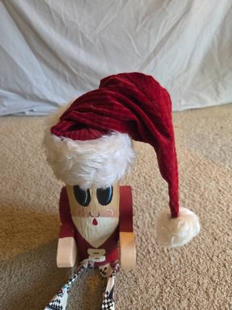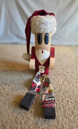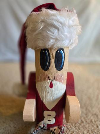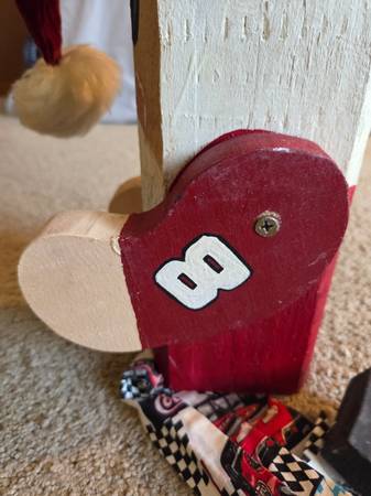 Used, displayed only, and in great condition. It does have some wear and the Santa Cap needs to be cleaned, but still looks good. Great for any Nascar fan. The Santa head and body is all wood with fabric hat and legs. The feet are small black wood blocks. It's hand painted. The Santa hat and legs are fabric. One arm has a number 8 and the other has Bud King of beers. It's 13" tall x 5" long x 6" wide.