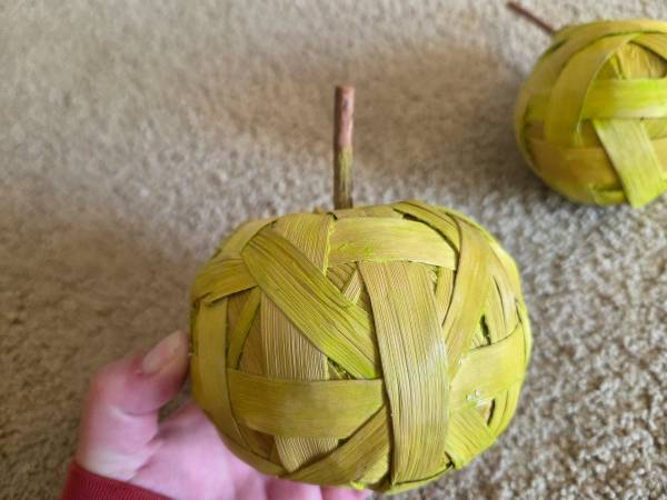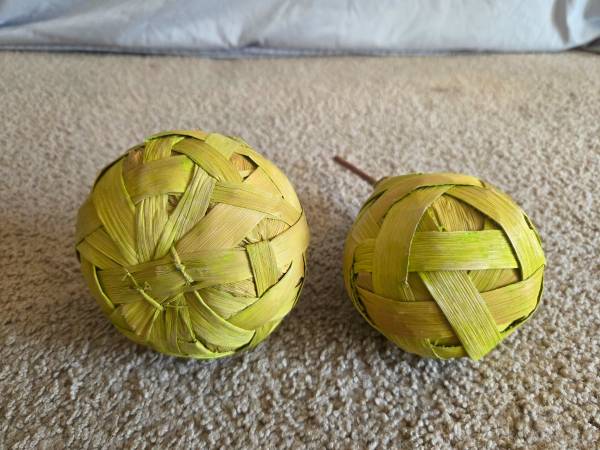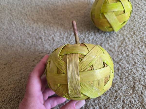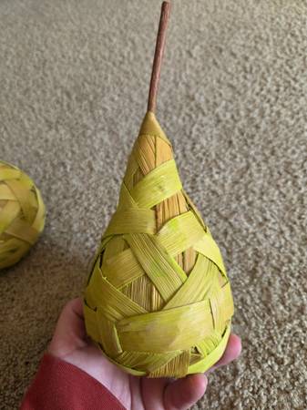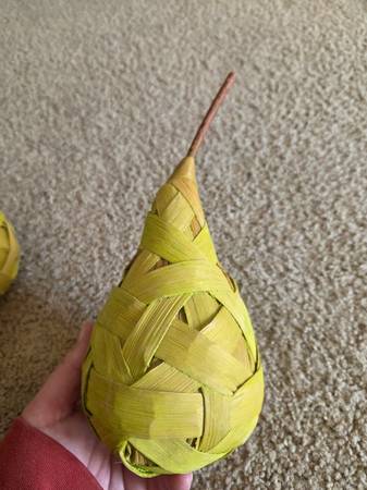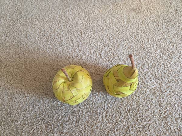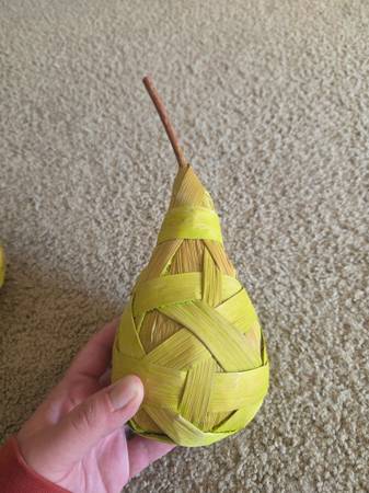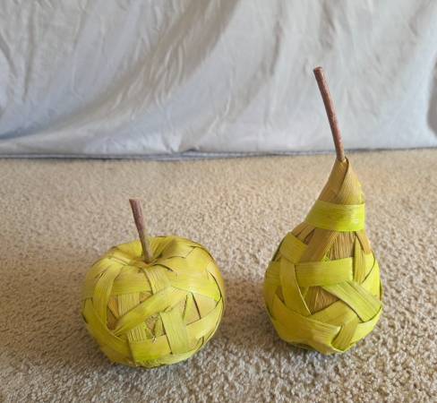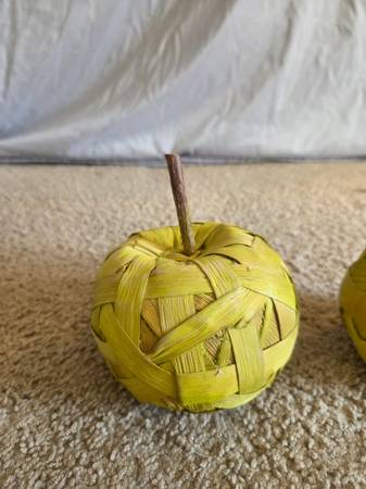 Gently used and in excellent condition, like new. 1 wicker pair and 1 wicker apple. They are a yellowish green color and are very pretty. They have sticks for stems. The apple body is 3" long and about 5" round. It's about 5" long with stem. The pear body is 6.5" long and 4" round at the base. It's about 9" long with the stem. They are thick sturdy wicker and stand on their own.