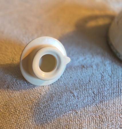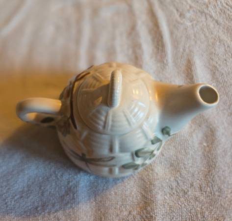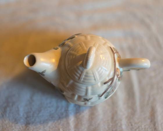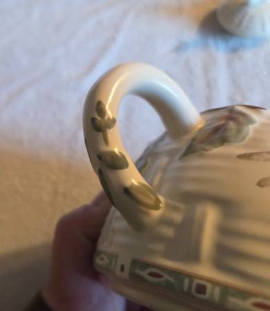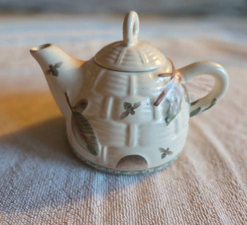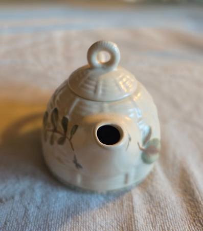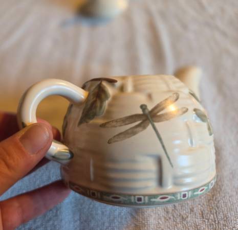 Very gently used, displayed only, like new. There are no chips, cracks or breaks. The teapot is an off-white beige color with a raised quilt like pattern. Painted branches, leaves, bees on side and, a dragonfly on the other side. Mostly greens and browns. I believe it is a ceramic pot, but I'm not sure. It's 5" tall x 5.5" long x 4.5" wide.