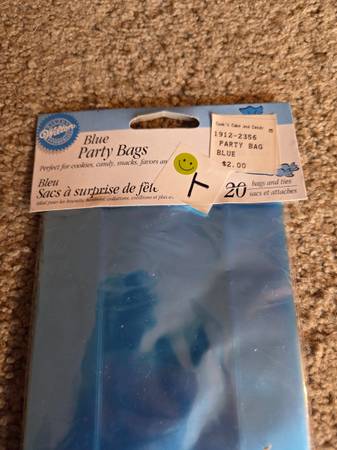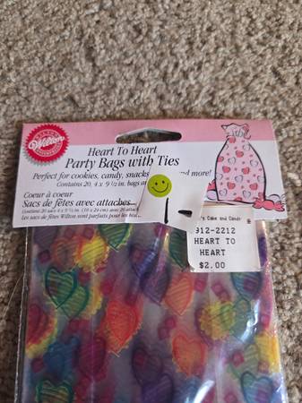 Set of 2 Wilton 20 count party bags. 1 set is a clear blue color and the other is multicolored hearts. Both sets come with matching ties. They are 2 for $1 or 50 cents a piece.