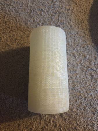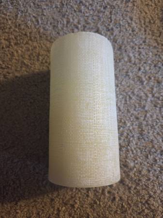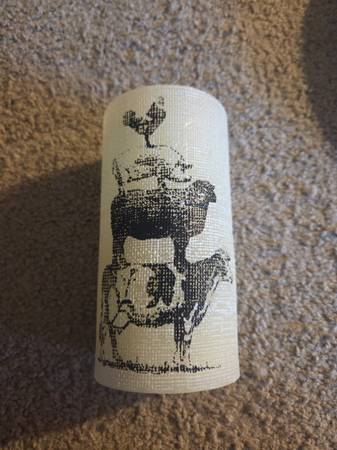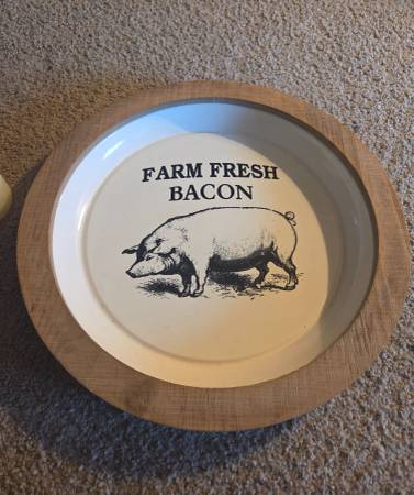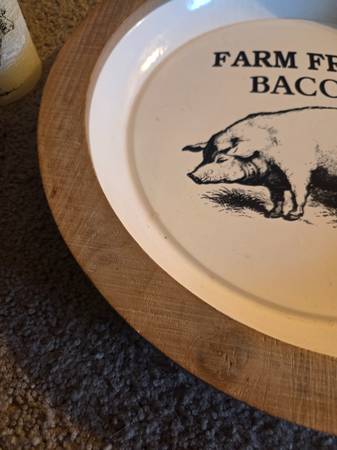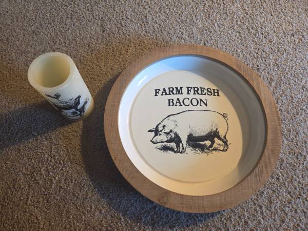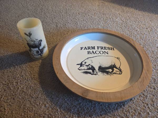 Both items were gently used and are in excellent condition, like new. There is a large bowl with wood rim featuring a pig with farm Fresh bacon all in black. The plate is an off-white cream color made of metal. It has an small triangle hook on the back for hanging. It's 15" round and about 1.5" in height. Then there is the battery operated flameless pillar candle, it's of a cow, sheep, pig and chicken standing on each other. It's in black with the candle being a beeswax color and texture. The candle takes 2 double A batteries and it's 6" tall and 3" round.