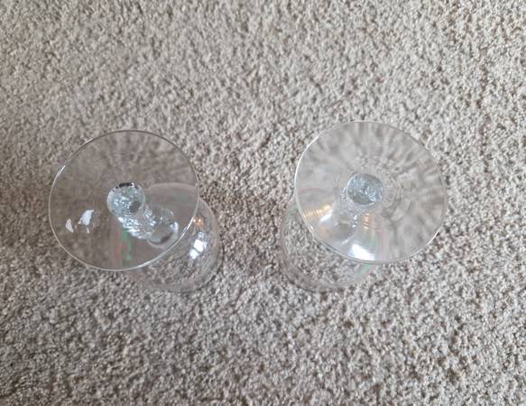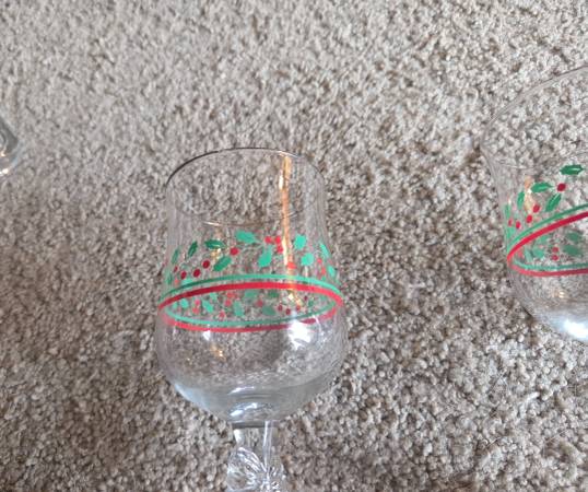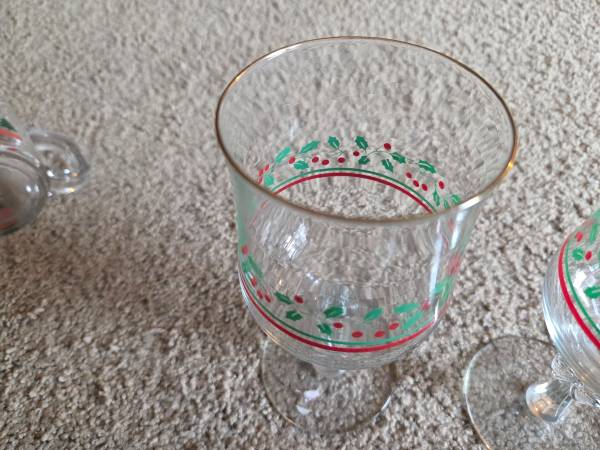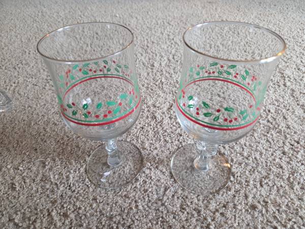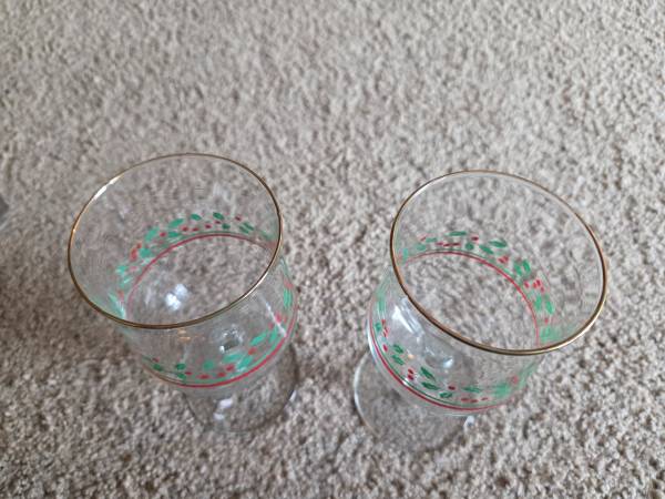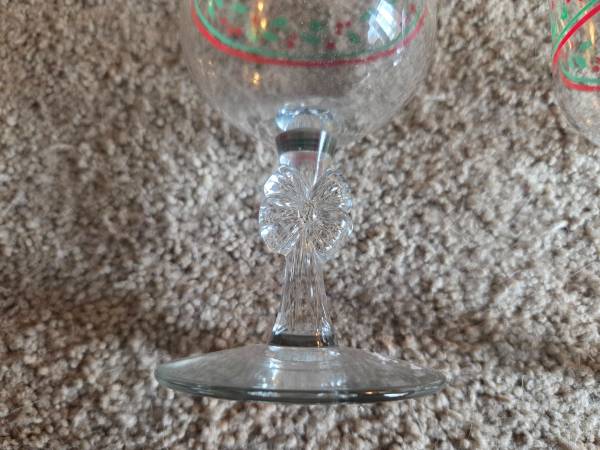 2 long stem glasses that are also all clear glass. They have a red and green line with holly berry design. They have a gold rims and the stems have a clear 3D bow. They are 7" tall x 3" round.