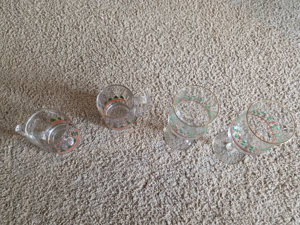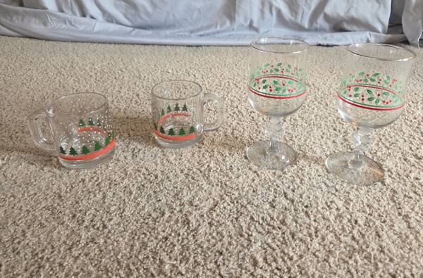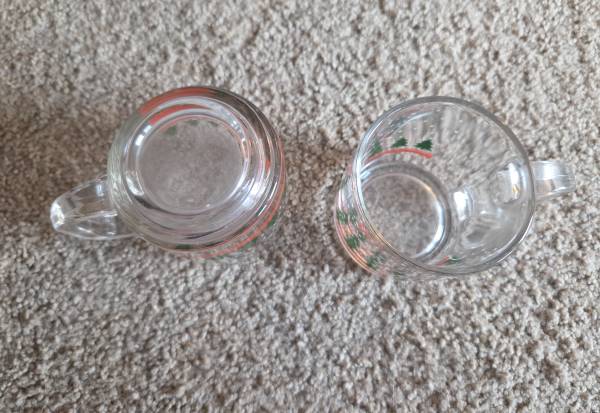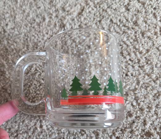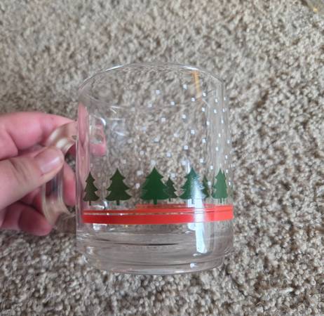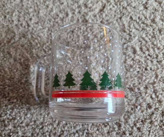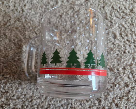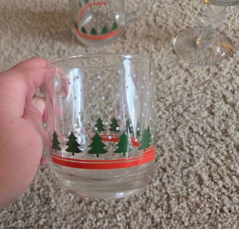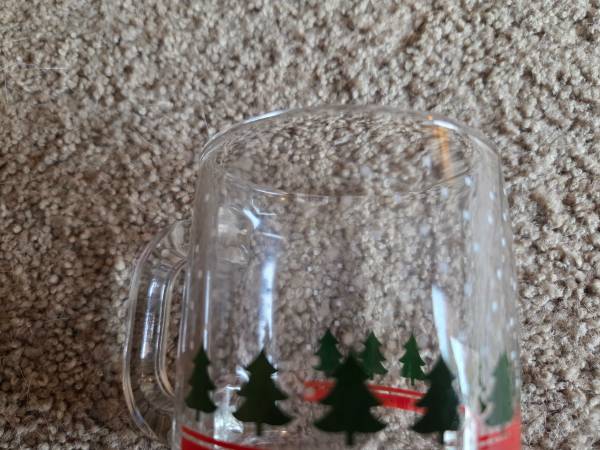 2 clear glass coffee mugs with handles. Thewhole glass, including the handles are clear. They have a red line with green pine trees and white round dotted snowflakes decorating the glass. They are 3.5" tall x 4" long x 3" wide.