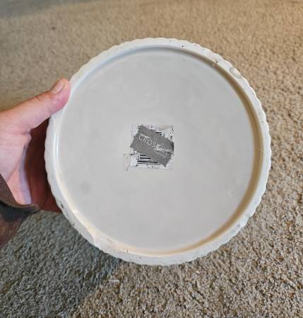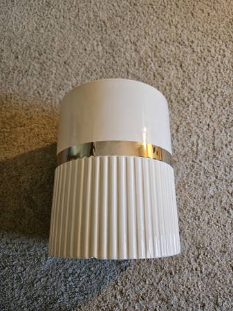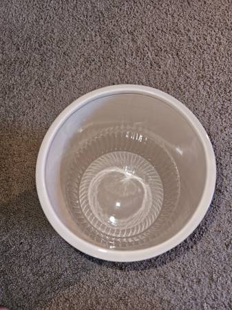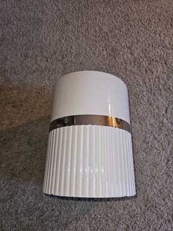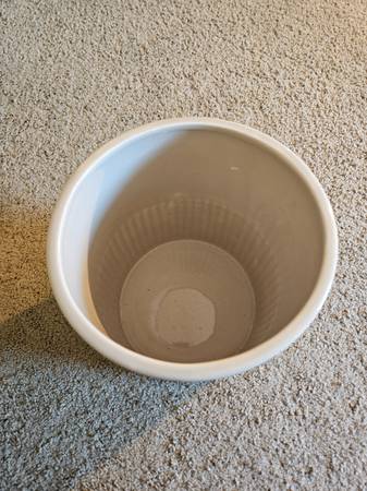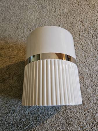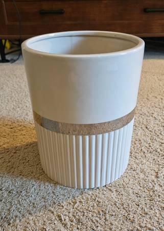 Gently used and in excellent condition, would be like new, except for a few small chips on the bottom base. This is a porcelain bathroom waste paper basket. It's color title is relaxed striped, a beige color with a shiny silver reflective stripe. It's 7.5 inches round by 9.5" inches tall.