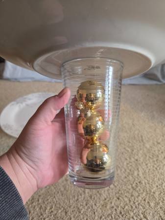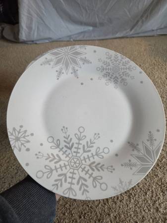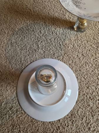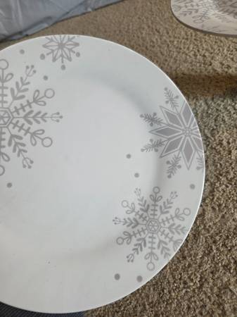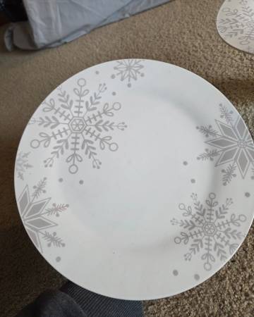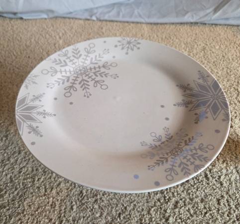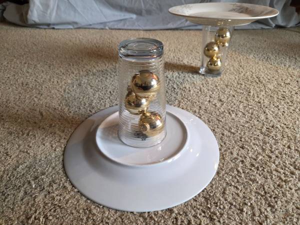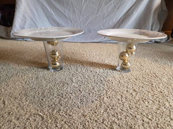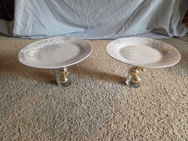 They have never been used, new. They are gorgeous stands that can be used or simply displayed. They feature white plates with shimmery gray snowflakes of various shapes and sizes. The base is a clear striped glass with 3 gold colored ornaments inside. They are 7" tall and 7.5" round.