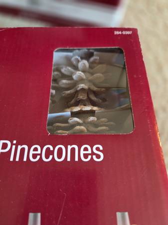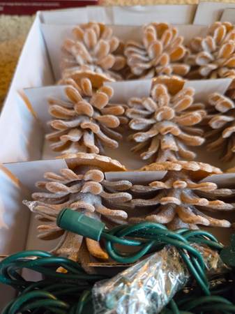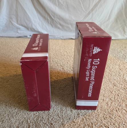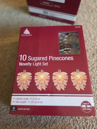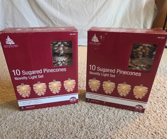 Both sets are new and still in the box, they were never used. They are by Enchanted Forest and are gorgeous sugared pineconnes. They are for indoor use only and they have plugs at both ends. They are electric plug-in with the classic hunter green cord. They are each a 10 count with the total length of 11-1/4'. The lighted length is 9' and the bulbs are spaced 12" apart.