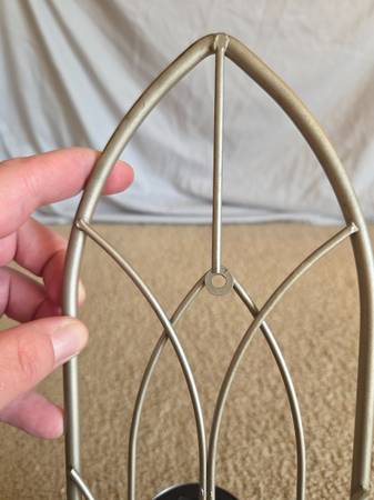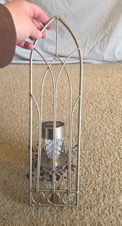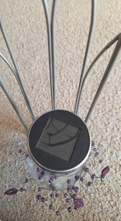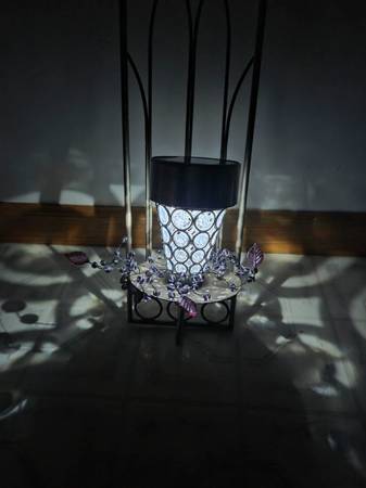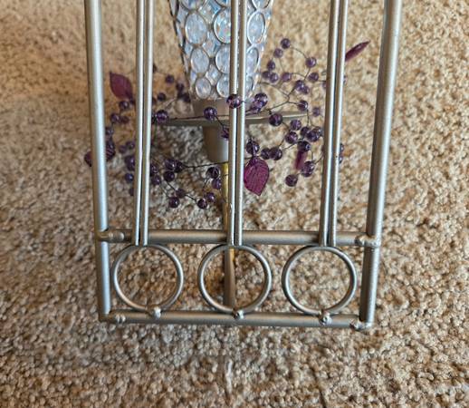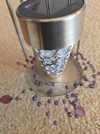 New, never used, in excellent condition. There arex2 small marks on the frame but it's very pretty. This is a hanging display with a metal frame that has a silver beige finish. There is a beautiful purple beaded leaf wrap around the light. The solar light is chrome with metal loops throughout the light. There are clear sparkly gems. Inside the metal loops that cast a pretty pattern at night. This is for indoor and outdoor use, if inside the room has to have a lot of light. The LED light is a bright white. There is a small metal loop for hanging. It's about 17.75" tall x 5" long x 4.5" wide.