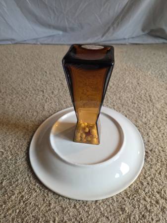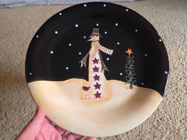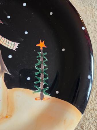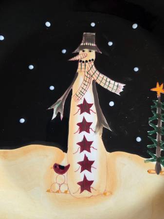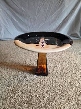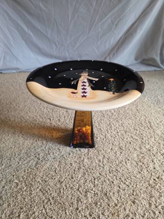 The stand has never been used, new. It's a gorgeous cake stand that's great for cakes, appetizers, crackers and cheese and move. It is also beautiful to just display. Features a off white and black plate with a snowman and a small Christmas tree. The base is a clear dark brown glass with some small glittery red and white balls. It's 8.75" tall and 11.25" round.