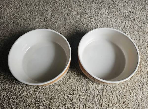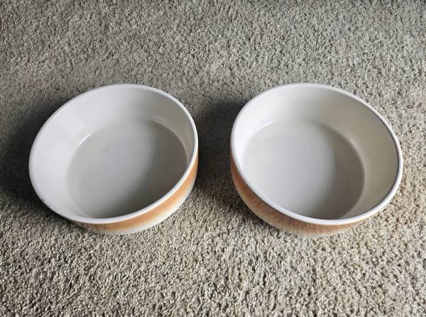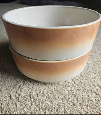 They are in excellent condition, like new. No scratches, knicks or chips. They are 8.5" round and stand 3" tall. They are stackable, microwave and dishwasher safe. These dishes are Stoneware so they are heavier. They are a light beige color transitioning into a carmal color.