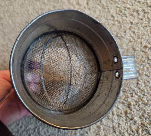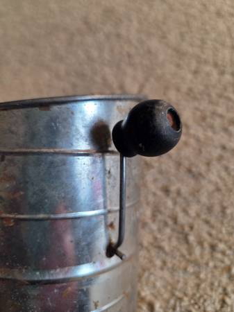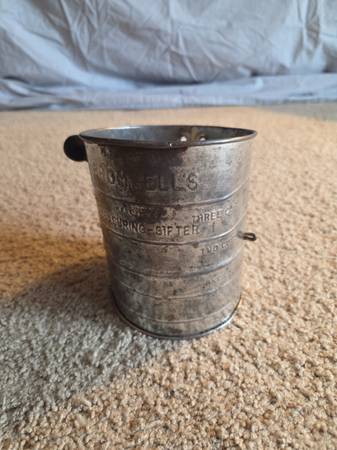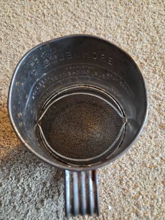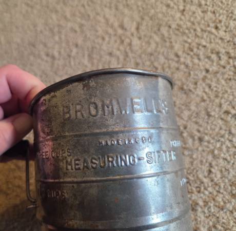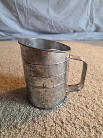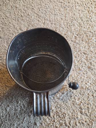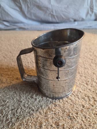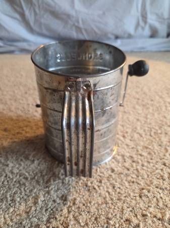 Vintage 1960's Bromwell's 3-cup measuring flour sifter, from the mid-20th century. It's a hand-crank sifter made of metal with a wooden knob on the handle. It's designed to measure and sift flour for baking, with markings for one, two, and three cups. Vintage Bromwell's sifters are popular collectibles, especially among those interested in farmhouse or country kitchen decor. This one is in working condition with lots of aged rusty crusty patina adding to its vintage charm.