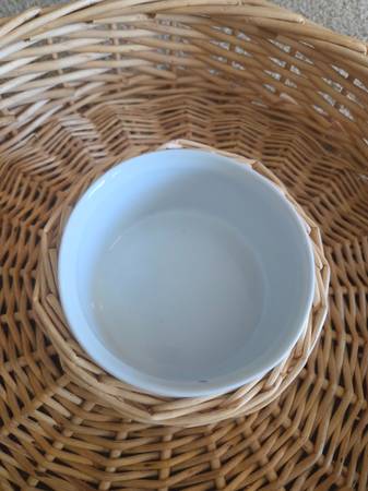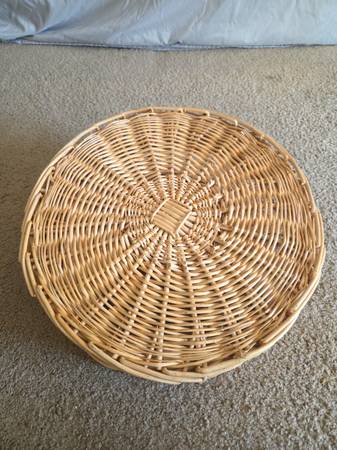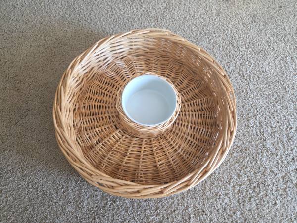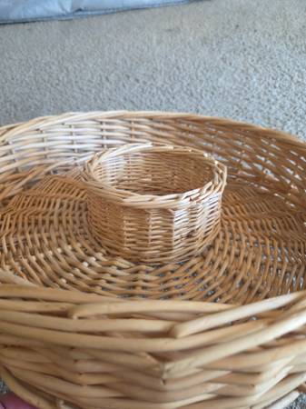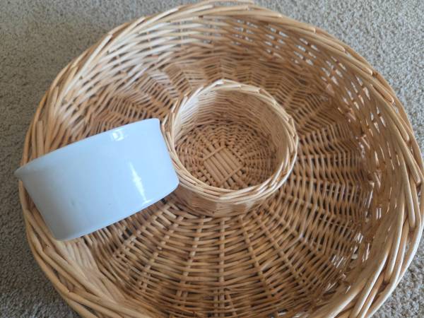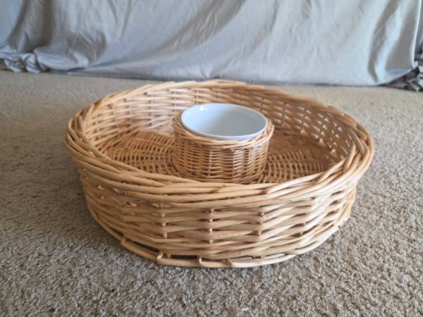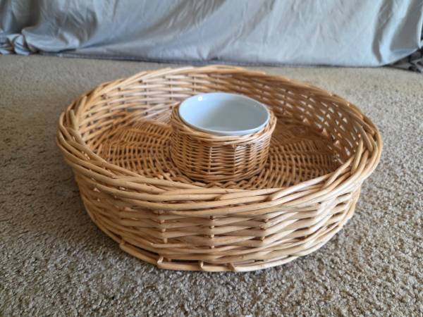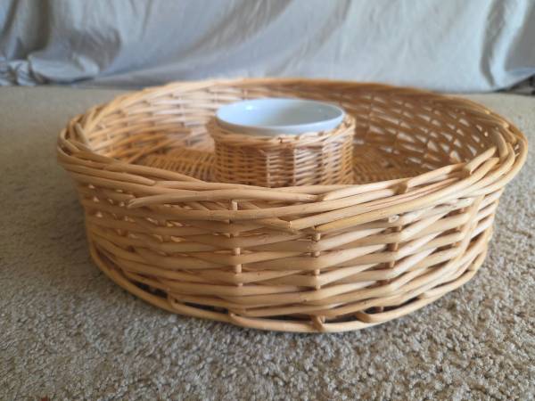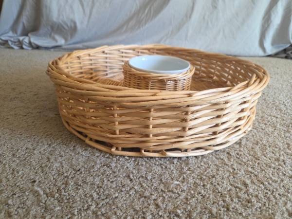 Gently used and in excellent condition, almost like new. There is 1 small break on the top outer edge. It's made of all wicker except for the glass bowl. It's a light colored wicker and the wicker is thicker, sturdy and solid. The bright white glass bowl in the center is removable for easy fill and clean up. Very pretty basket and great for hosting. It's 15.25" round and 4" tall. The inside of the basket is about 2.5" deep and the dip holder diameter is about 4.75" round. The bowl is 4.75 round and a little under 2.5" tall.