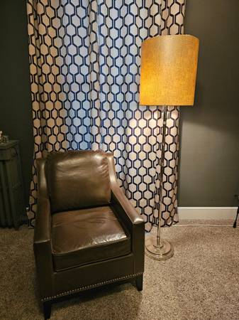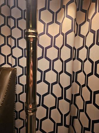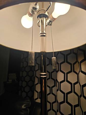 Absolutely beautiful tall floor lamp. Chrome finish. Double pull for two bulbs. Bamboo style with a faux snakeskin lampshade in cream. Stands 68 inches