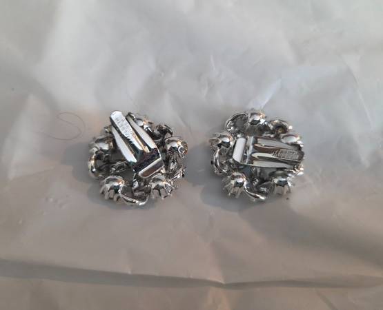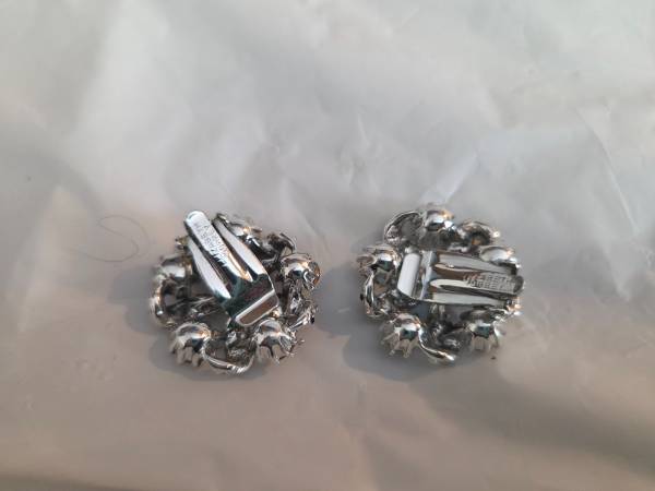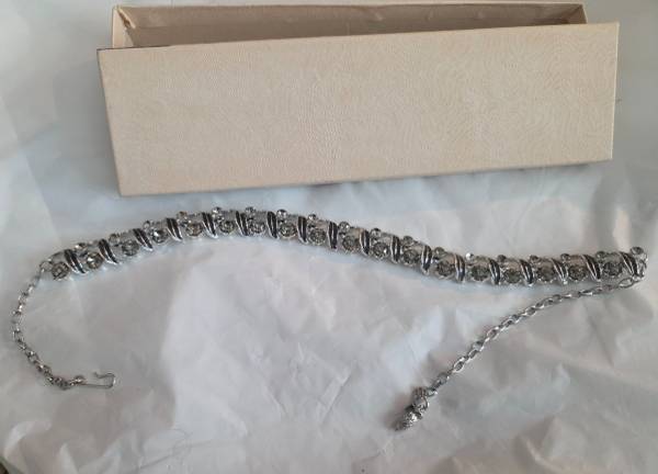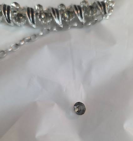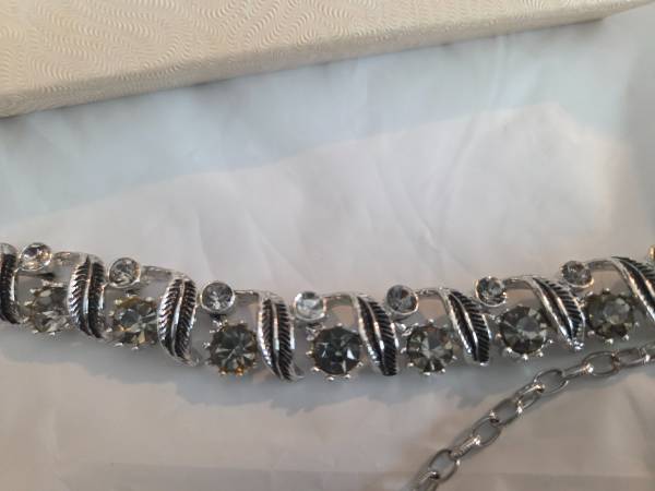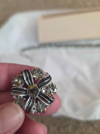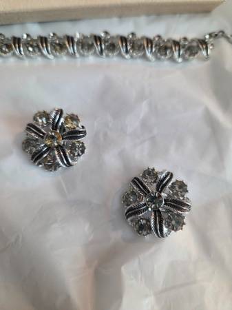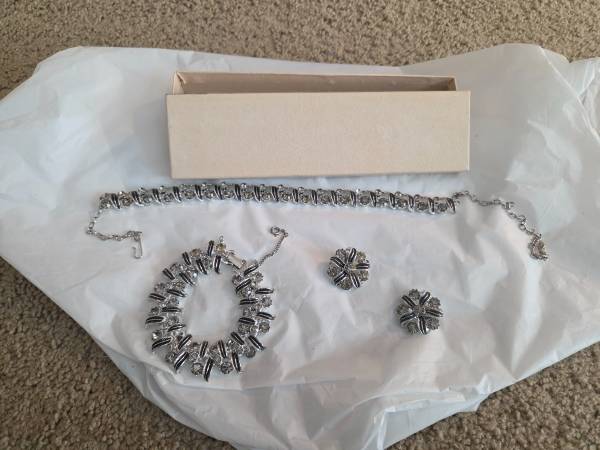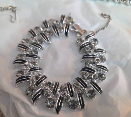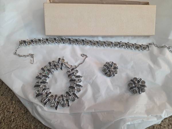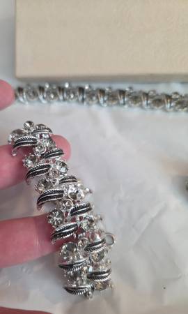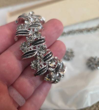 Gently used and in excellent condition, 1 gem is loose but in the box, it just needs to glued or placed back in. This is a stunning silver (not sure if it's real silver or just plated) set with clear round gems of various sizes and a black and silver leaf pattern. Very sparkly and makes a statement. The set comes with 2 clip on earrings that are about 1" round. 1 bracelet, about 3" round and 1 necklace about 17.5" long.