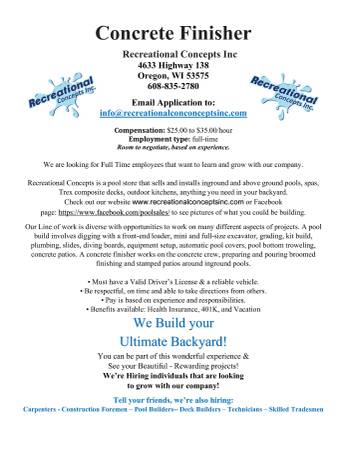 You will be laying concrete around each pool we build and any steps or landscaping areas that concrete is needed.