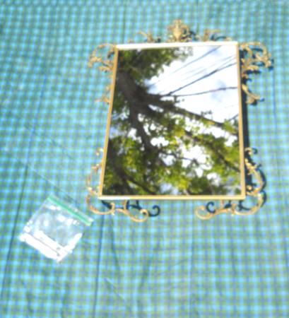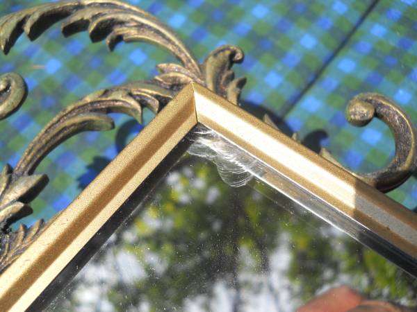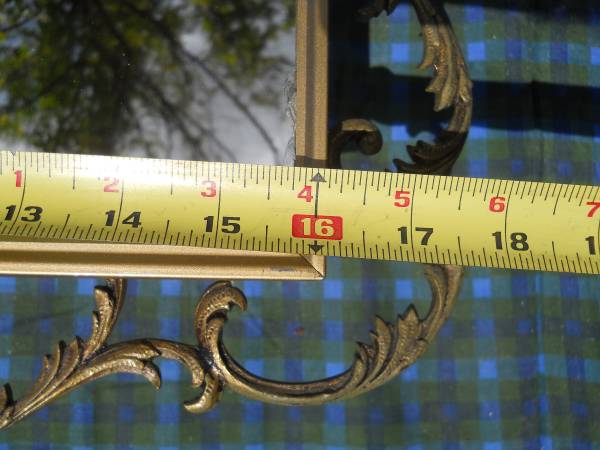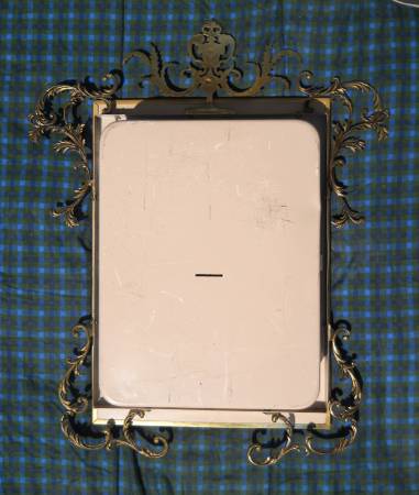 Offering a LARGE Vintage Ornate Brass Recessed Medicine Cabinet with Glass Shelves. The mirror is 22 inches Tall x 16 inches Wide, but the brass decoration goes around this to the outside overall dimensions are larger. It should fit into a 17 1/2 inch x 13 1/2 inch recess. The glass shelves are 13 inches Wide x 4 inches Deep, and have an etched finish if that is what it's called. There is a tiny, slight flaw in the mirror in the upper right hand corner. The inside is cream colored and is basically pretty clean. The two shelves come with mounting hardware. All the brass ornamentation is still straight and true.
