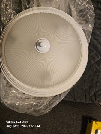 14 inch ceiling light fixture, new never used. White with a frosted, swirling glass globe