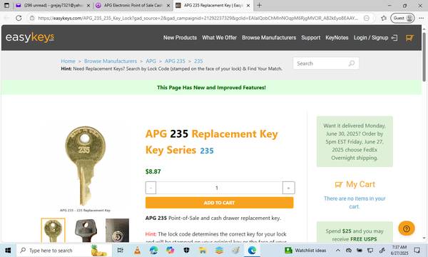 APG Standard 13” Electronic Cash Draw with 4 bill & 4 coin compartments. If ad is up, it's available. Replacement keys available on-line. Reply with phone number by email/ chat feature for call...