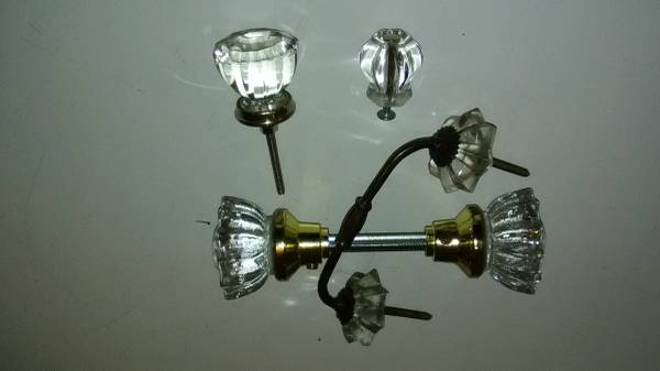 Six sets of glass handles and knobs and 1 set of glass door knobs. Good for a bedroom or bathroom, etc. If this posting is showing, it's available! Reply with phone number by email or chat feature...