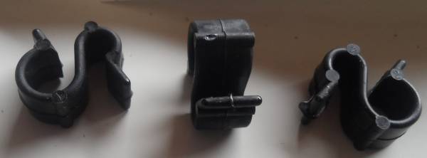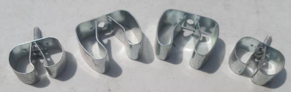 BROOM CLIPS: Metal clips that can be attached to walls, door, closets, etc. in order to organize and hold brooms by the handles. other similar size handles, or other items. Have two large and two smaller clip with screws. Used.
