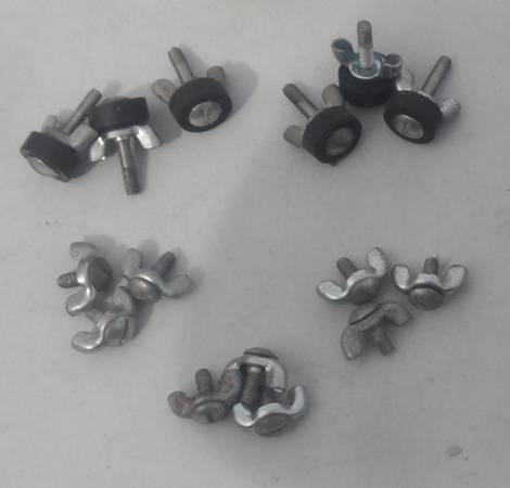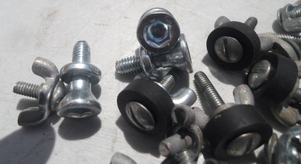 NUTS AND BOLTS: A number of wing nuts, bolts, rubber washers, 5mm chrome bolts, and more.