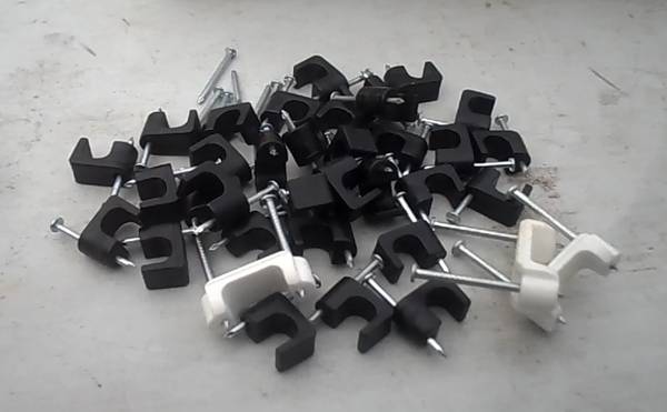PLASTIC WIRE STAPLES: 33 black/small and 3 white plastic wire staples.