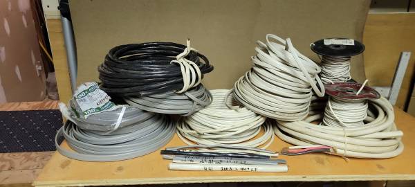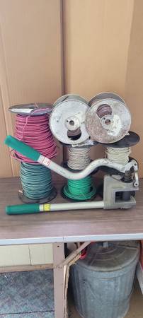 Length of wire based on weight;10/3 NM-B w/g (with ground) 52 FT. 120.00,10/3 UF-B W/G 49.94 ft (50 FT) 90.00, 8/3 NM-B without Ground 44 ft.70.00, 12/3UF-B W/G (Underground Wire) 37.7 ft. 60.00, 12/2 UF-B W/G 59.77 ft. 60.00,14/3 W/G NM-B 160ft. 70.00, 12/2 W/G NM-B 138.5 ft. 80.00, Single braided or solid wire , Green 10 gauge THHN Solid Wire 5000ft roll 3/4 full 80.00, Red 10 AWG THHN solid 500 ft. roll almost full 80.00, White 12 AWG STR Stranded wire 500ft. roll 1/3 full 20.00, Green 12 AWG STR 500 ft. roll 1/3 full 20.00, White 12 AWG 1/4 of 500 ft roll 10.00, T-SAT Wire 18-2 1/3 of 500 ft 10.00, 18-2 1/4 full of 500' 10.00, 18-5 1/2 of 250 ft. roll 25.00, 20-7 wire 3/4 full 500 ft. roll 40.00, GREEN LEE STEEL STUD PUNCH MODEL 710 LIKE NEW 160.00 Items priced as much as half retail or more. Respond via Craig list on specific wire , will remove item off list once sold.