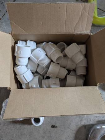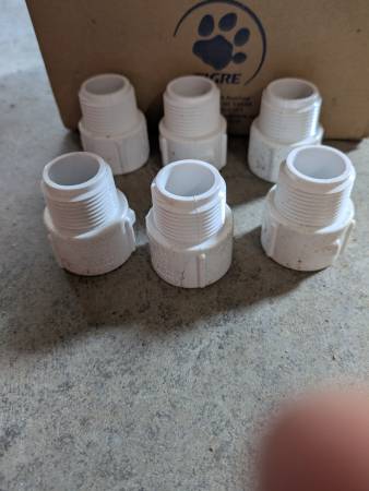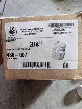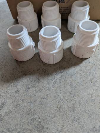 Box of 50 PVC 3/4 male adapters. Brand new. 1.64 ea at Menards. All 50 for 35.00. please text only. After 8am, before 8pm. Thanks for looking. Six 08 six 1778 three 8
