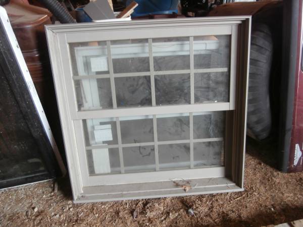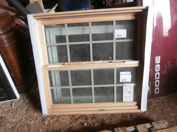New Windsor Pinnacle series aluminum clad double hung window 41 3/4" x 41" R.O. champagne exterior, pine interior grid in glass