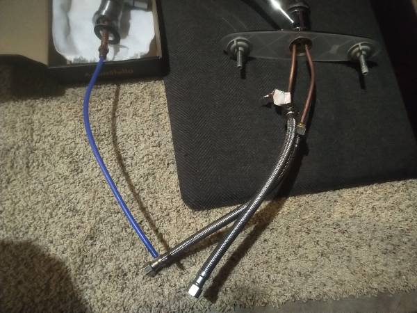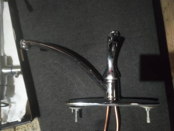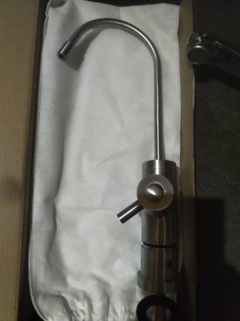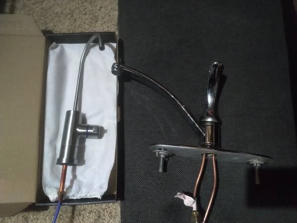 Both faucets in good shape, just replaced with different fixtures to match new lights. The kitchen faucet is a Delta with a chrome finish and is a bit old/worn but works fine. The filtered water tap is a brushed nickel Culligan fixture and is in good shape, really solidly built and has a nice finish, should work with any under-sink filter or reverse osmisis system. Both have supply lines still attached as shown in photos so should be ready to go.
