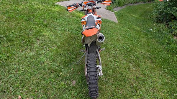 Good shape EXC-F 500. Has new Rekluse clutch (less than 100 miles on it), has GET ECU upgrade with TacoMoto custom maps. I just had the bike serviced last summer at Rob's Performance Motorsports. They rebuilt the front struts and replaced a valve lifter in the engine. It's been de-smogged and has low restriction pipe tip. I just changed the oil this spring and have barely ridden it at all. A couple 20 minute sessions putting around the yard with my son on his small bike. I have had this for 4 years and have hardly ridden it. The riding I do is very easy trail riding, again usually with my son who puts. It's way more bike than I need.