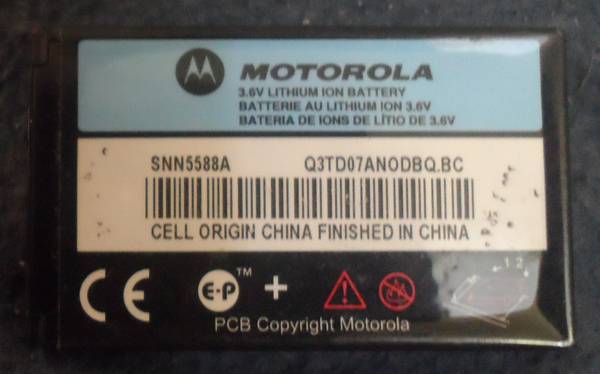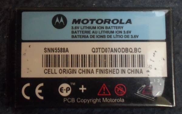 CELLPHONE BATTERY: A Motorola Brand 3.6 volt lithium ion battery. Common use in cellphones. SNN5588A Q3TD07ANODBQ.BC. SIZE: 2-1/8” x 1-1/4” x 1/4”.
