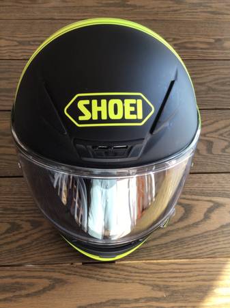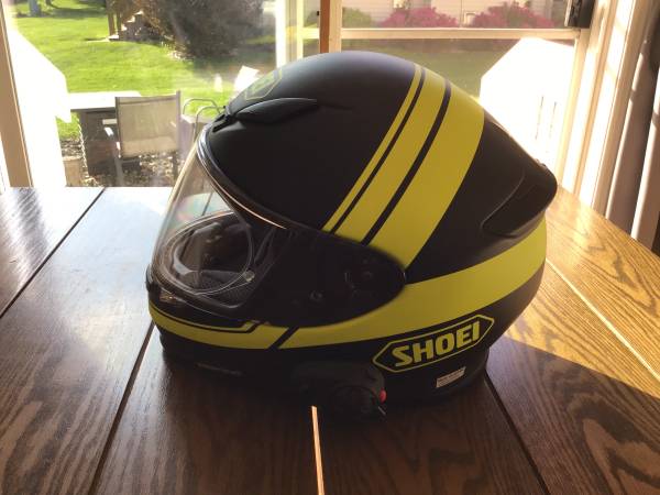 Shoei motorcycle helmet with Sena intercom system. Excellent condition. Size Large. Text five 6 three five 8 one zero 0 eight 1.
