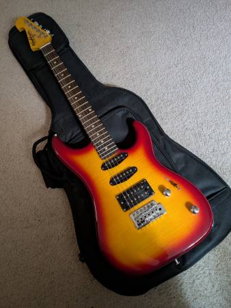 For Sale: Beautiful Sunburst Washburn Sonamaster Guitar. Nuno Bettencourt Design Rare Reverse Headstock and super straight neck with low action for easy chording / fingering. HSS Electrics perfect as is everything about this Guitar. Comes with padded Gig Bag, whammy Bar and strap. $129.00