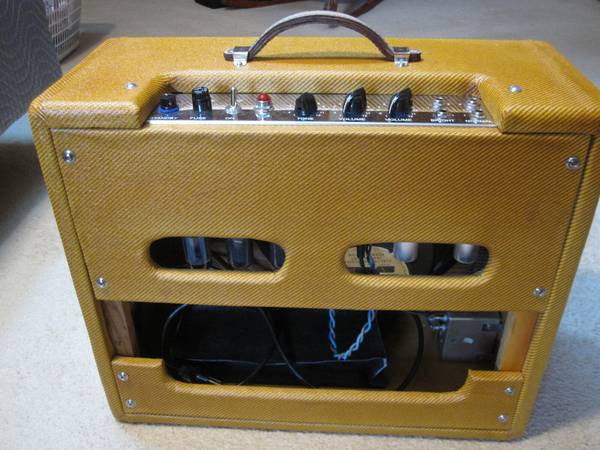 Slightly modified hand wired 5E3 Tweed Deluxe with added spring reverb. Dry signal path all tube as original circuit. Reverb drive/return SS external electronics next to tank with control knob in "standby" location (see pictures). Unplug the reverb and you have a bone stock 5E3. Solid pine cab, shellac tinted and lacquered tweed, used vintage Jensen speaker and American 5Y3/6V6GT tubes. Never left the house.