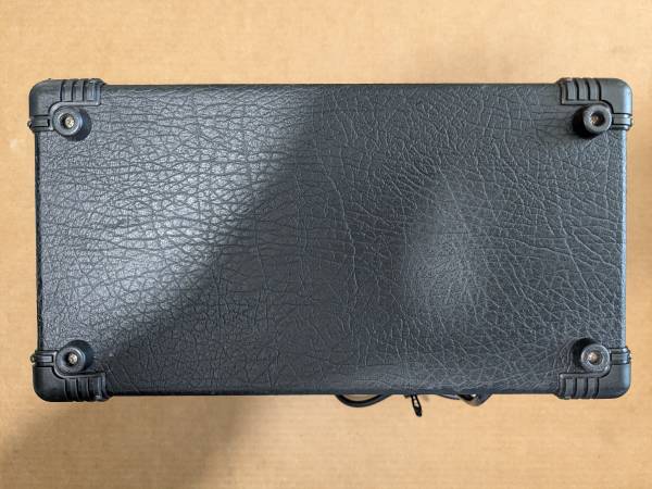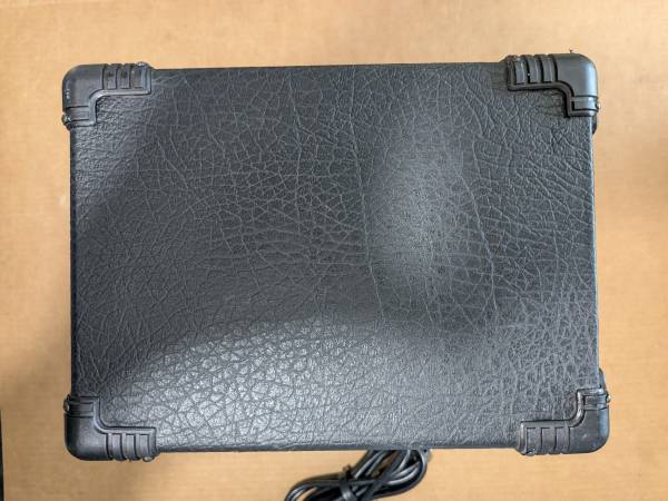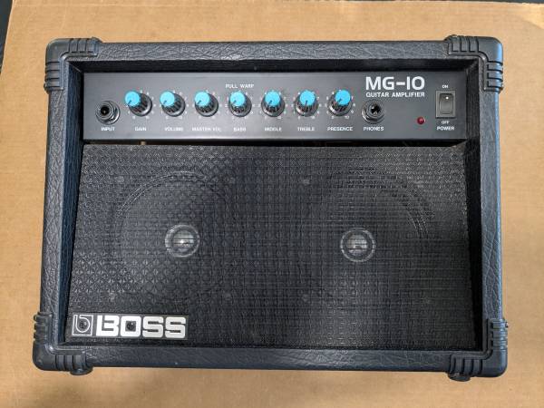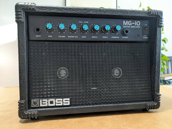 This Boss MG-10 is a gently used guitar practice amp from the 1990s. It has solid-state electronics, a closed-back design with a front-facing port, and pushes 10 watts at 4 ohms to two Roland-designed 5-inch speakers. It shows few signs of wear and works much better than you would expect considering it's age.