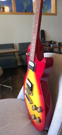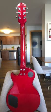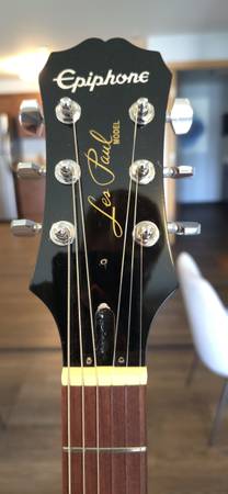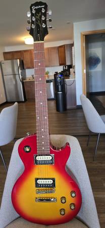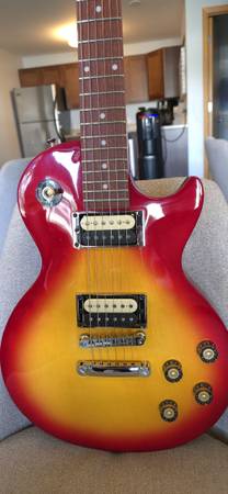 Epiphone les paul model.,cherry Sunburst finish. The guitar it is in excellent shape and it's a great starter guitar for a young artists. It's been professionally set up by myself so it stays in tune great and plays very easy. Guitar comes with a soft case
