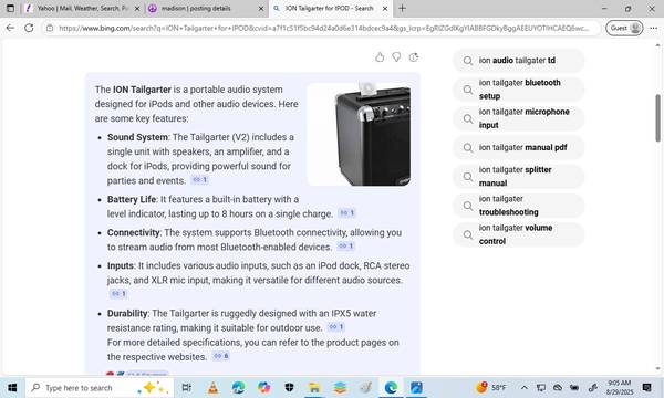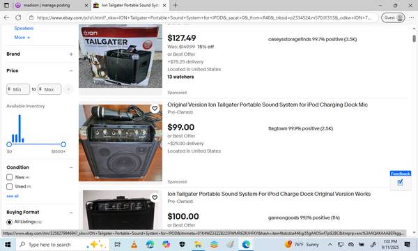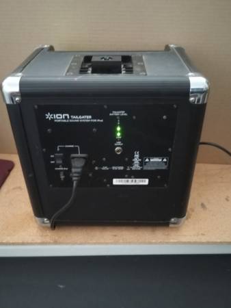Original generation *ION Tailgater Portable Sound System w/ IPOD dock, instrument, microphone, line in/ out ports, on-board battery and 65 watt output. Use to play your tunes or amplify your instrument or voice. If ad is up, it's available. Reply with phone number by email or chat feature for prompt call back.