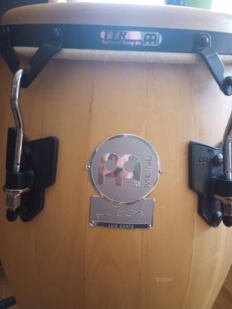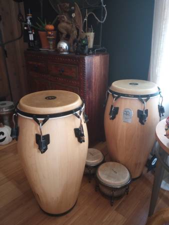 Great sounding natural finish with black powder hardware congas with stands for sale. The congas (conga and tumba) have never been dropped or damaged but do have just a few slight dings from contact with other congas that naturally will occur with a conga drum over time. But overal look beautiful and well taken care of. These congas are 966.00 NEW with stands. These drums have a wonderful tonal quality without any annoying ringing. Comes with bag and tuning wrench. I love these congas but ive developed joint and tendon issues that make them too painful to play.