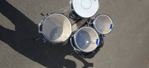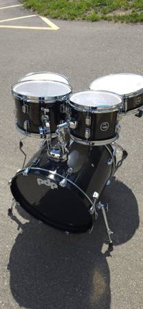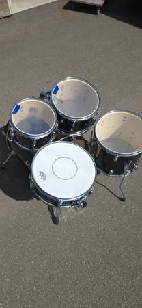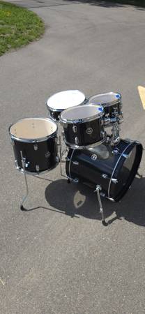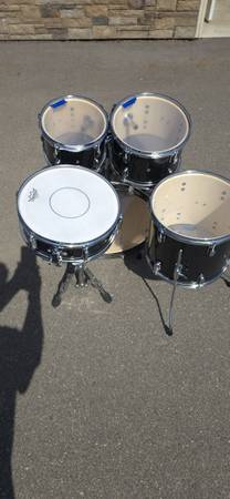 Great solid 4 piece entry level drum kit for sale. Gloss black wrap finish with Chrome hardware. Drum sizes are 10" 12" Mounted Tom's and 14" floor tom with 3 floor Tom legs.