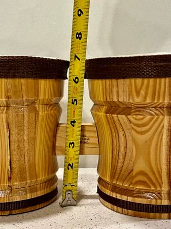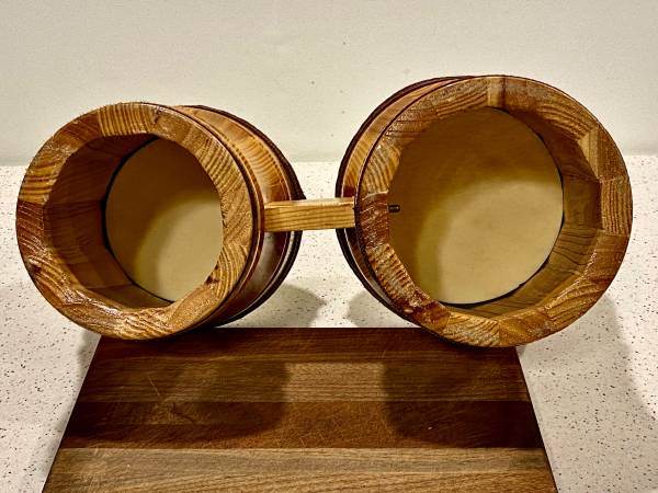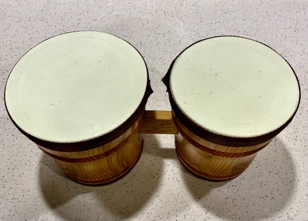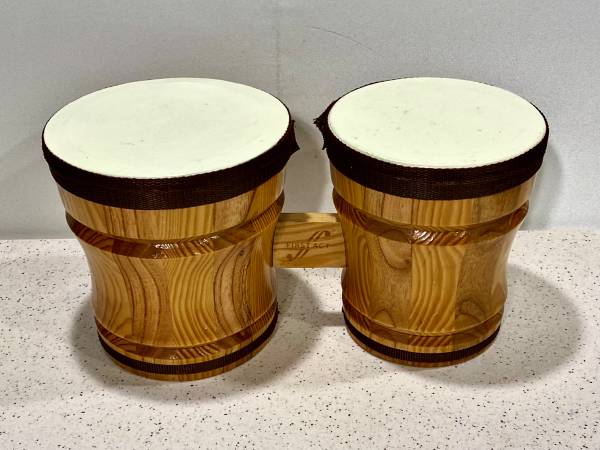 Vintage First Act Wood Bongo Drums Percussion Instrument. This is for Set of First Act 04/07/2011 GX Made in China by First Act Inc. There are 2 sizes of bongos 5.75” and 6.5” diameters with varying tones. There is a wood arm connecting them is together that can easily removed if you choose. Solid wood, Poly coating, Band strap top and bottom, measure 13.25” long. 7" tall. In Very Good Condition, They are Used, Some minor Scuffs.Scrapes, Please LQQK at all pictures as they are the Main Description. Thanks For LQQKing.