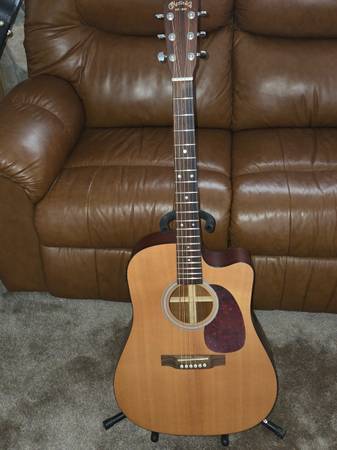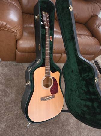All solid wood dreadnought acoustic-electric guitar from Martin's 1-Series, featuring a Sitka spruce top, Sapele back and sides, and an East Indian Rosewood fingerboard and bridge. It includes a Fishman electronics system for amplified performance and is known for delivering a rich, commanding Martin tone at a more accessible price point. The guitar has a single cutaway body, a modified low oval Rust Stratabond neck.