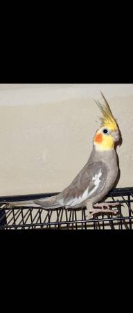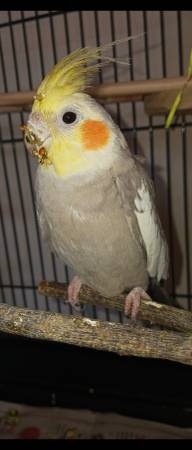 Cheeki (male) is a gray cockatiel with orange cheeks. He’s very cute but shy — definitely not hand-tame yet. He was undersocialized when I got him and still hisses when hands get close, though sometimes he lets me pet his head if I move slowly. He’ll need patience and time from someone experienced with birds.